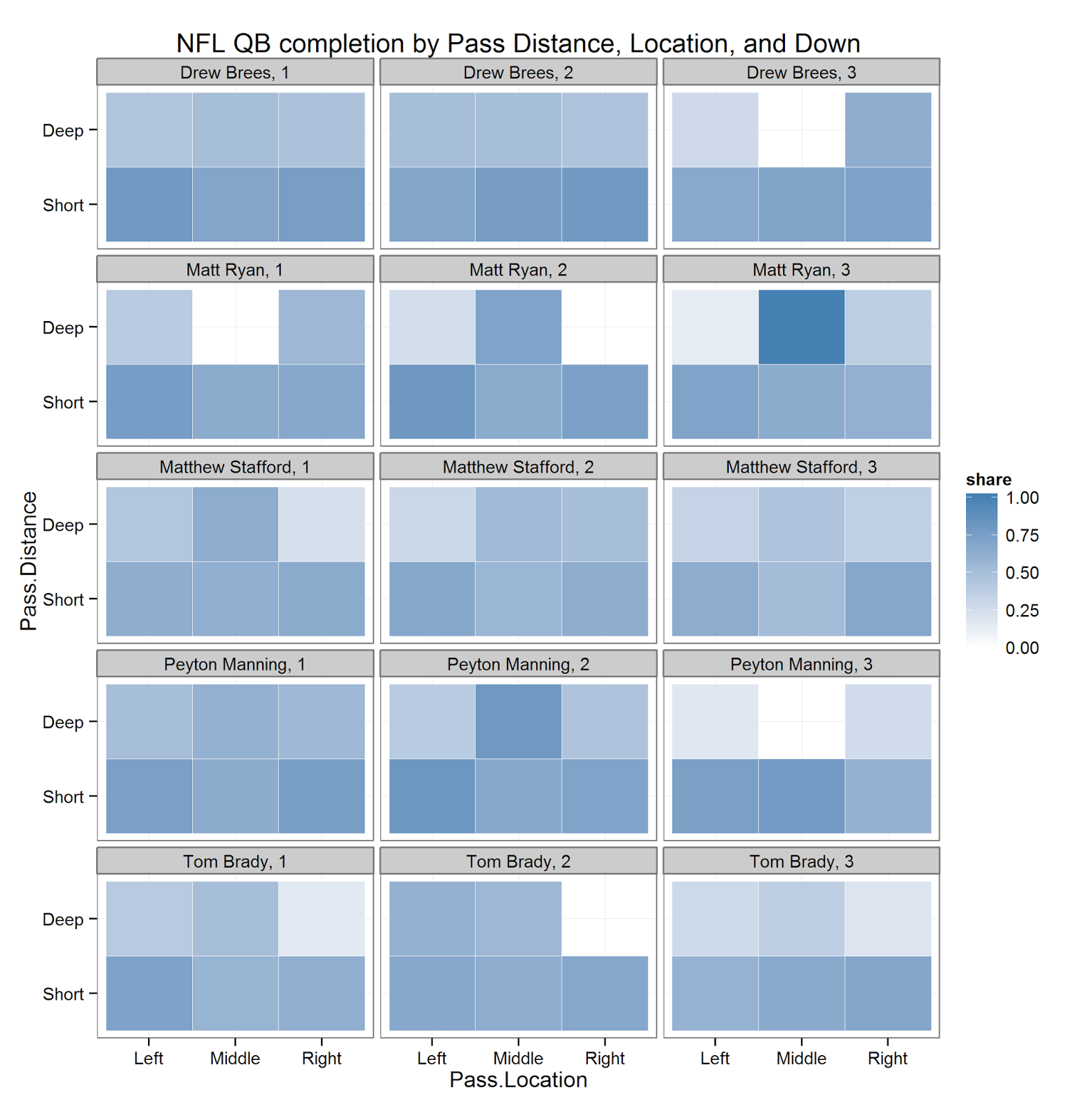 library(dplyr) library(ggplot2) # note: change path to the dataset df = read.csv("C:/Users/Mark/Desktop/RInvest/nflpbp/2013 NFL Play-by-Play Data.csv", stringsAsFactors = F) passers = df %>% filter(Play.Type == "Pass") %>% group_by(Passer) %>% summarize(n.obs = length(Play.Type)) %>% arrange(desc(n.obs)) top.passers = head(passers$Passer,5) df %>% filter(Play.Type == "Pass", Passer %in% top.passers) %>% mutate(Pass.Distance = factor(Pass.Distance, levels = c("Short","Deep"))) %>% group_by(Down,Passer,Pass.Location, Pass.Distance) %>% summarize(share = (sum(Pass.Result == "Complete") / length(Pass.Result)), n.obs = length(Pass.Result)) %>% filter(n.obs > 5) %>% ggplot(., aes(Pass.Location, Pass.Distance)) + geom_tile(aes(fill = share), colour = "white") + facet_wrap(Passer ~ Down, ncol = 3) + scale_fill_gradient(low = "white", high = "steelblue", limits = c(0,1)) + theme_bw() + ggtitle("NFL QB completion by Pass Distance, Location, and Down")
